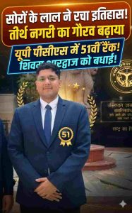 सोरों (कासगंज): उत्तर प्रदेश लोक सेवा आयोग (UPPCS) का परिणाम रविवार देर रात घोषित किया गया, जिसमें तीर्थ नगरी सोरों के मेधावी छात्र शिवम भारद्वाज ने शानदार सफलता हासिल करते हुए प्रदेश में 51वीं रैंक प्राप्त की है। इस उपलब्धि से न सिर्फ उनके परिवार बल्कि पूरे क्षेत्र में खुशी और गर्व का माहौल है।